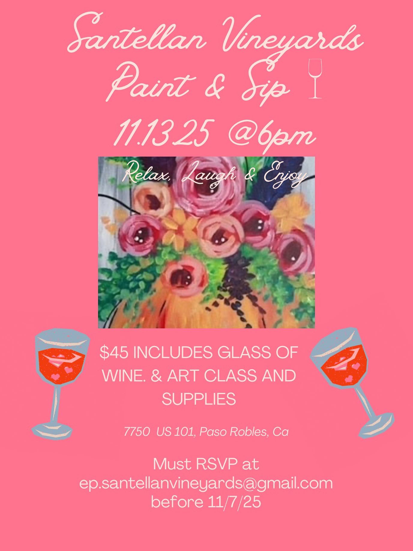 Join us for an evening of art, wine, and relaxation at Santellan Vineyards! On November 13th at 6pm, we’re hosting a Paint & Sip event where you’ll create your own beautiful floral masterpiece while enjoying our award-winning wines.